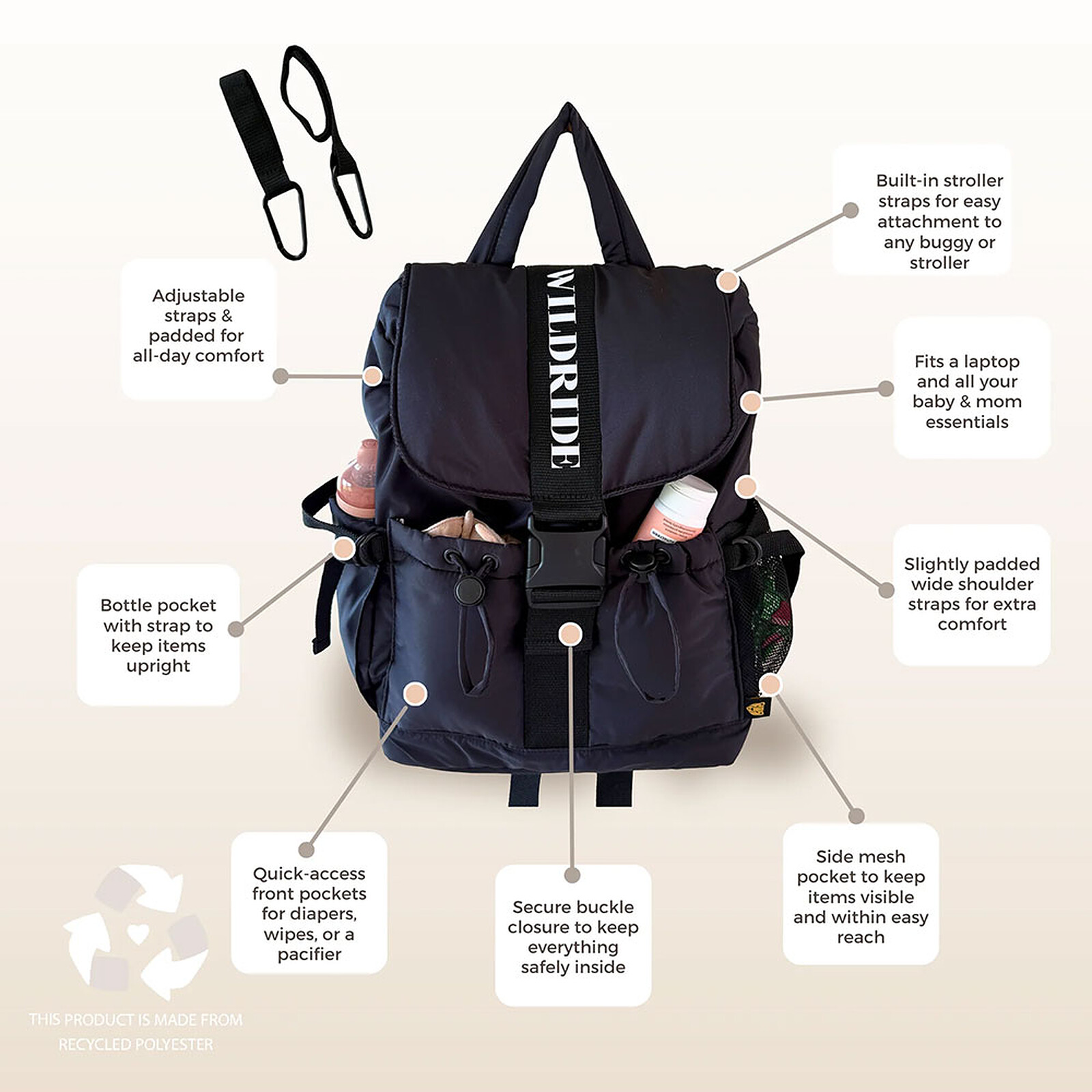 Spacieux, léger et robuste, il permettra d'emporter avec soi tout le nécessaire pour bébé en restant libre de ses mouvements.