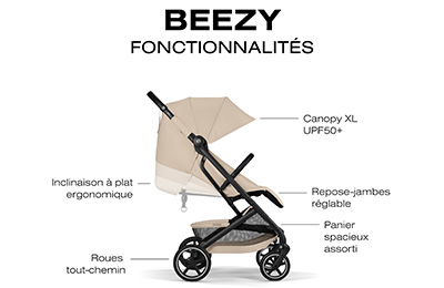 Des promenades agréables dès la naissancePrête à accueillir bébé dès la sortie de la maternité, la Poussette Beezy vous proposera une position ergonomique entièrement à plat pour coucher bébé.Le repose-jambes ajustable selon plusieurs positions offrira à votre enfant une position de repos adaptée et toujours très agréable. Grâce à la suspension intégrale, les irrégularités des chemins sur lesquels vous vous trouverez seront absorbées. Votre enfant pourra se reposer sans interruption. Faite pour les parents et les enfants qui bougent, cette poussette vous proposera un Travel System 2-en-1. Vous pourrez installer un siège auto de la marque Cybex ou Good Baby à l'aide d'adaptateurs vendus séparément. |