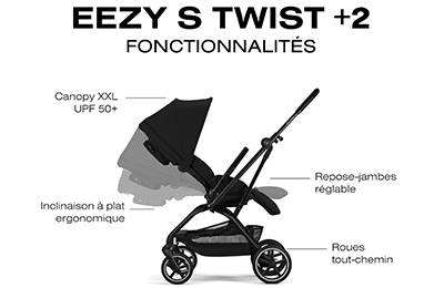 Un confort à toute épreuveLa fonction d'inclinaison du dossier vous permettra de naviguer facilement entre trois positions différentes pour un confort optimal. Disposant d'une position dos à plat, la Poussette Eezy S Twist+2 pourra être utilisée dès la naissance. Elle sera notamment très pratique le moment de la sieste venu.Les quatre roues tout-terrain et leurs suspensions garantiront une douceur à votre tout-petit et une maniabilité à toute épreuve. Des terrains pavés, aux trottoirs irréguliers en passant par les sentiers ruraux, cette poussette sera à l'aise sur tous les terrains. Qu'il fasse beau ou qu'il y ait quelques turbulences, bébé sera toujours à l'abri grâce au canopy XXL pare-soleil extensible. La visière intégrée le protégera par tous les temps. Confortable pour bébé mais aussi pour les parents, sa fine silhouette et ses 45 cm de largeur font qu'elle pourra se faufiler absolument partout. |